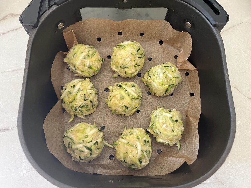 Forme mit den Händen die Frikadellen, indem du leichten Druck ausübst, und platziere sie entweder im Korb der Heißluftfritteuse oder im Backblech für den Heißluftfritteusenofen (du kannst sie auch im statischen Ofen bei 180 Grad etwa 35-40 Minuten backen). Würze sie mit einem Sprühstoß von Olivenöl und gare sie in der Heißluftfritteuse bei 180 Grad für 12-15 Minuten, wobei du sie zur Hälfte der Garzeit wendest, oder bis sie goldbraun sind.