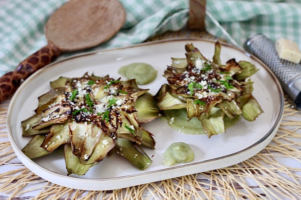 Die Artischocke wird nach dem Säubern im Ganzen gekocht, dann blütenförmig geöffnet und in der Pfanne mit einem Schuss extra natives Olivenöl gebraten. Serviert wird sie mit einer köstlichen Creme aus Artischockenstielen und Kartoffeln. Das Ganze wird mit geriebenem Parmesan, frischer Petersilie und einem Schuss Olivenöl verfeinert.