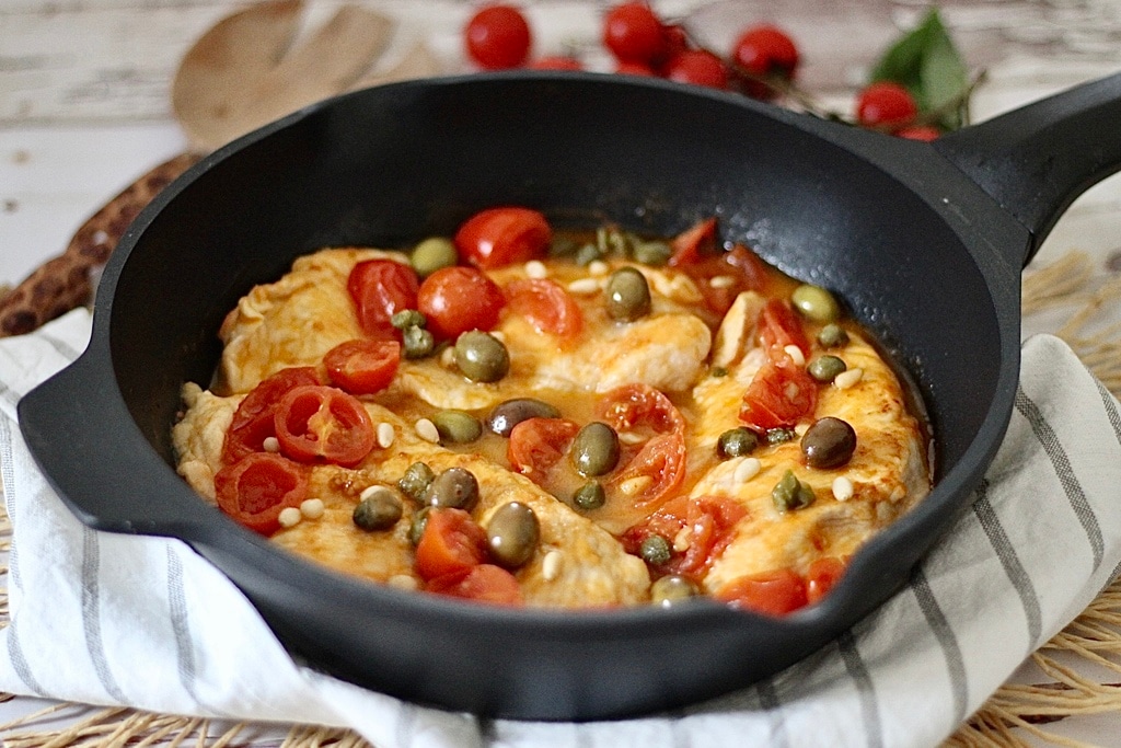 Die Hähnchenbrust, in Scheiben geschnitten, wird in einer Mischung aus Knoblauch und Kirschtomaten gekocht und mit Taggiasca-Oliven, Kapern und Pinienkernen angereichert, die dem Gericht einen frischen Touch geben.