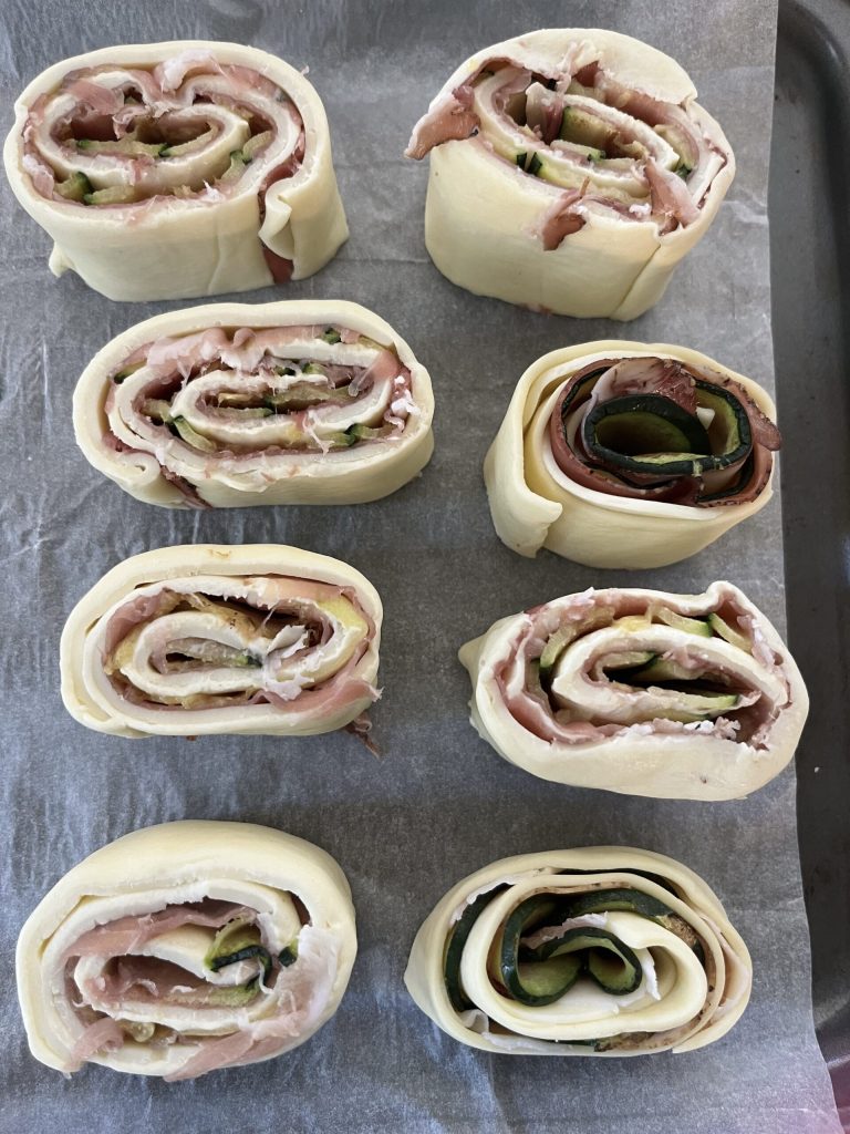 Die dünn geschnittenen Zucchini verschmelzen mit dem Käse, der beim Kochen schmilzt, während der Speck diese würzige Note hinzufügt, die die salzigen Blätterteigschnecken wirklich besonders macht.