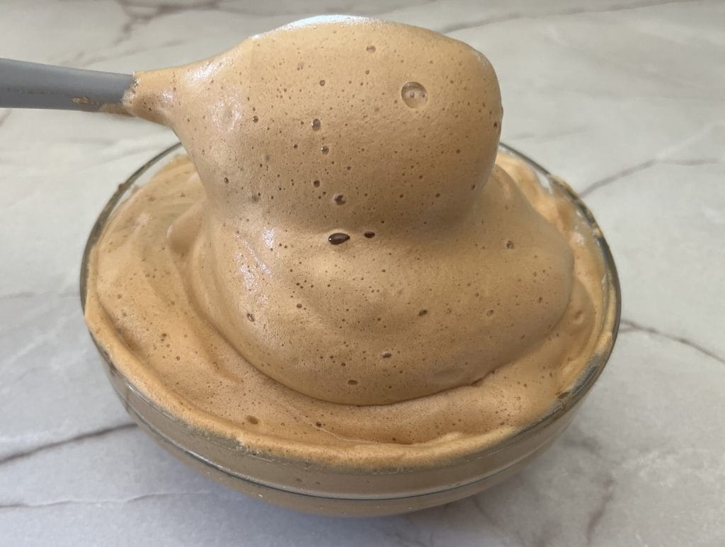 Das Wasser muss eiskalt sein, das ist entscheidend! Mit den elektrischen Schneebesen schlage mit mittlerer-hoher Geschwindigkeit für etwa 3-5 Minuten, bis die Mischung hell, dicht und schaumig wird wie geschlagene Sahne in Cappuccino-Farbe.