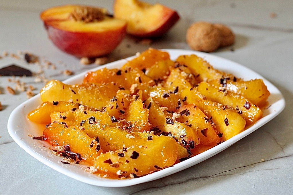 Die karamellisierten Pfirsiche mit Amaretti und Schokolade sind ein leckeres und gesundes Dessert, das du in 5 Minuten zubereiten kannst, ohne Teig und ohne Ofen.