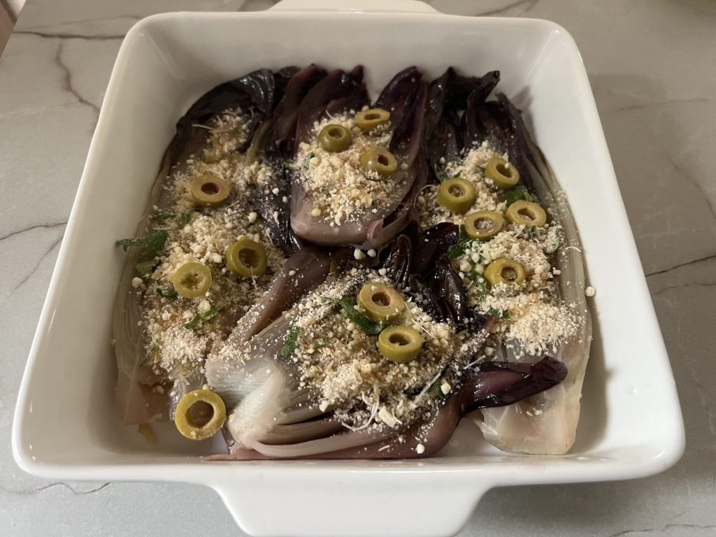 Ich bereite meinen Treviso-Radicchio in der Heißluftfritteuse vor, nachdem ich ihn kurz in einer Pfanne mit einem Schuss natives Olivenöl angebraten habe, damit er leicht weich wird und sein intensives Aroma freisetzt; danach verfeinere ich ihn mit knusprigen Semmelbröseln, Parmesan, in Scheiben geschnittenen Oliven und einer frischen Prise Petersilie – so entsteht ein perfektes Gleichgewicht zwischen leichter Bitterkeit und Würze – und gratiniere ihn dann ein paar Minuten in der Heißluftfritteuse.