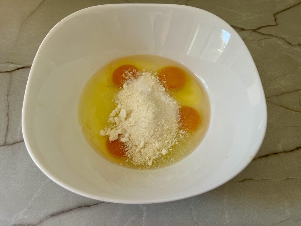 Den Parmesan hinzufügen und kräftig mit einem Handschneebesen schlagen.