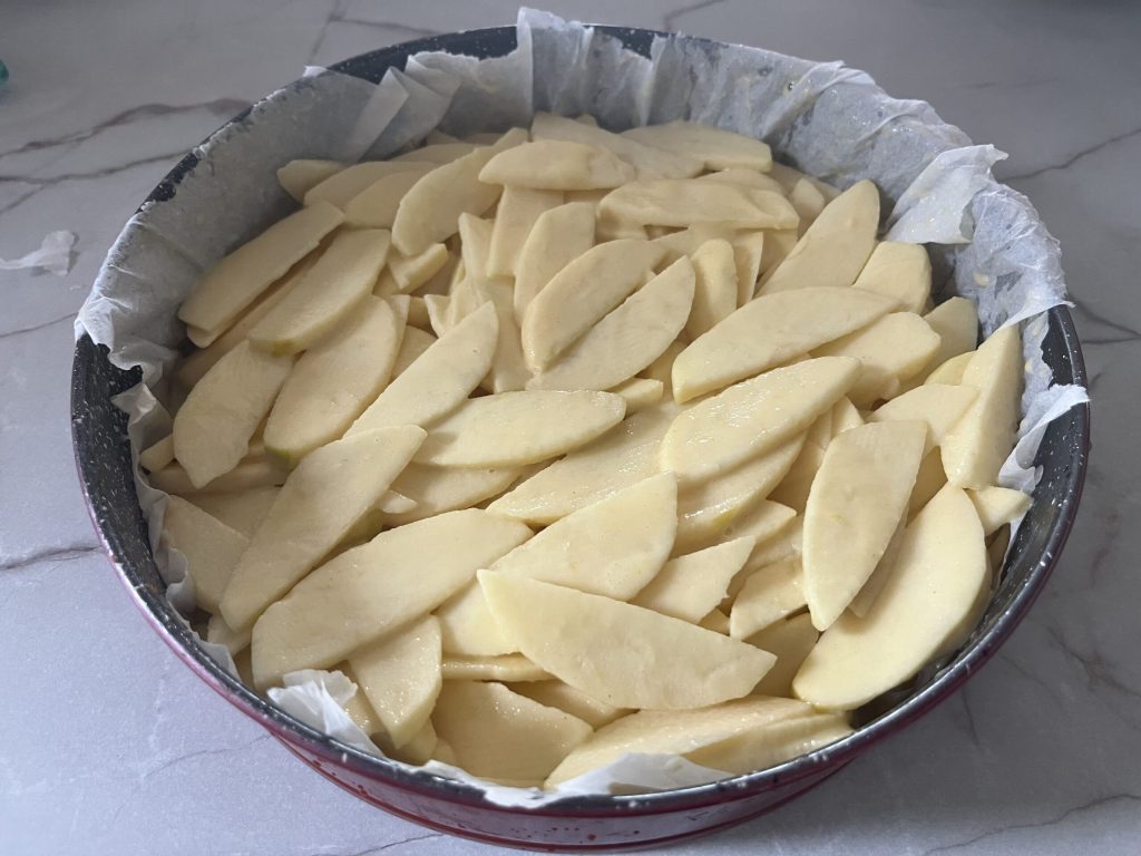 Lege eine Backform (Ø 24) mit Backpapier aus und gieße den Teig hinein. Lege die Apfelscheiben darauf und drücke sie mit einer Spachtel gleichmäßig in den Teig.