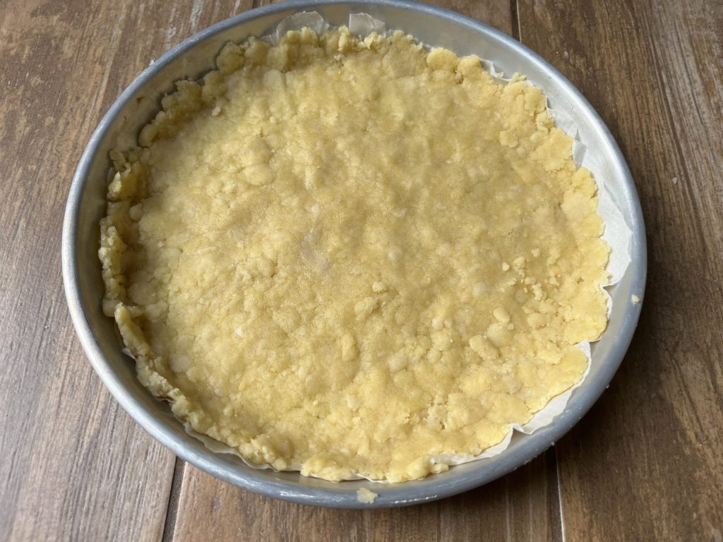 • Lege eine Form (Ø 20–22 cm) mit Backpapier aus. Verteile ¾ des Teigs auf dem Boden und drücke leicht an.