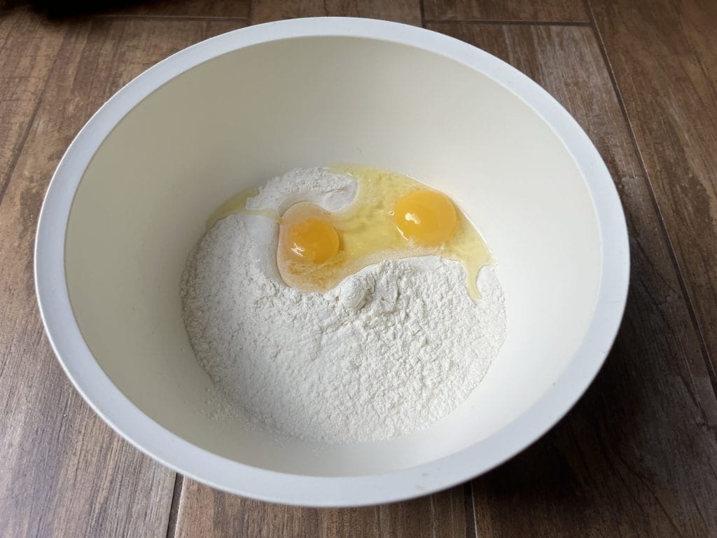 • Gib in der Zwischenzeit Mehl, das Ei plus das Eigelb in eine Schüssel