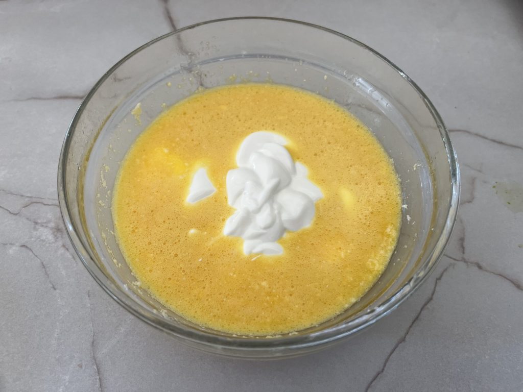 In einer Schüssel schlägst du die Eier mit einem Schneebesen zusammen mit Salz und Parmesan. Füge die pflanzliche Sahne hinzu.