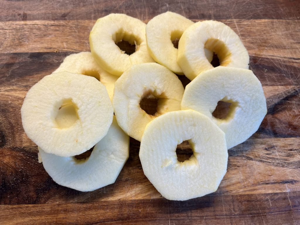 Schäle die Äpfel mit einem Kartoffelschäler und entferne das Kerngehäuse mit dem Apfelausstecher. Schneide sie in etwa einen halben Zentimeter dicke Scheiben. Lege die Apfelscheiben in eine Schüssel mit etwas Zitronensaft, um das Anlaufen zu verhindern