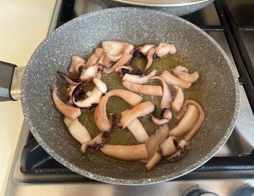 Um die köstlichen Spaghetti mit Tintenfischtinte zuzubereiten, beginnen wir damit, die Zucchini zu putzen und sie dann auf einem Schneidebrett in Scheiben zu schneiden. Dann reinigen wir die Tintenfische und schneiden sie in dünne Streifen. In der Zwischenzeit fetten wir eine antihaftbeschichtete Pfanne mit etwas extra natives Olivenöl und braten den Knoblauch an.