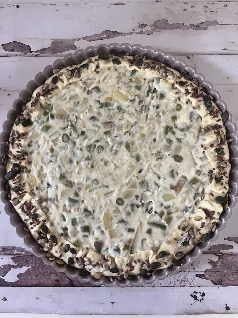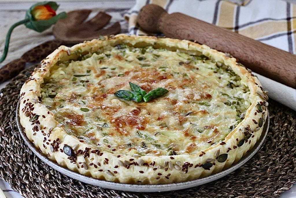 Der herzhafte Spargelkuchen hat ein einladendes und farbenfrohes Aussehen.