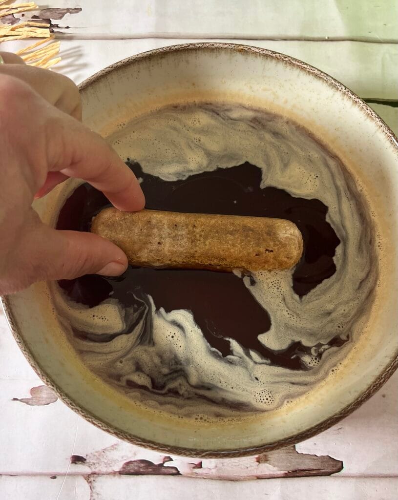Gießen wir den Kaffee in eine große Schüssel und tauchen die Löffelbiskuits schnell einzeln in den Kaffee, ohne sie zu sehr zu durchnässen. Wir legen sie auf eine Servierplatte oder in eine rechteckige Backform und bilden die erste Schicht.