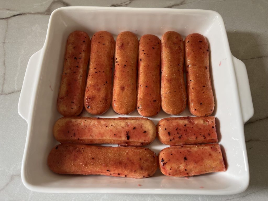 Mach eine weitere Schicht mit getränkten Löffelbiskuits.