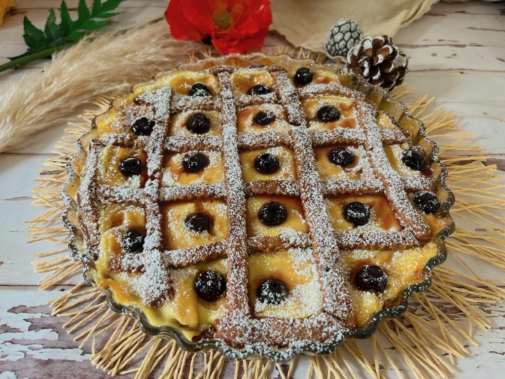 In der Zwischenzeit rollen wir mit Hilfe eines Nudelholzes den restlichen Mürbeteig auf einem Backbrett aus, bis wir ein Blatt von ca. 2 Millimetern Höhe erhalten, und formen die Streifen, indem wir sie mit einem Zahnrädchen oder einem Messer schneiden, mit denen wir die Torte dekorieren werden. Schließlich fügen wir die Sauerkirschen hinzu und backen bei 180 Grad für etwa 30 Minuten