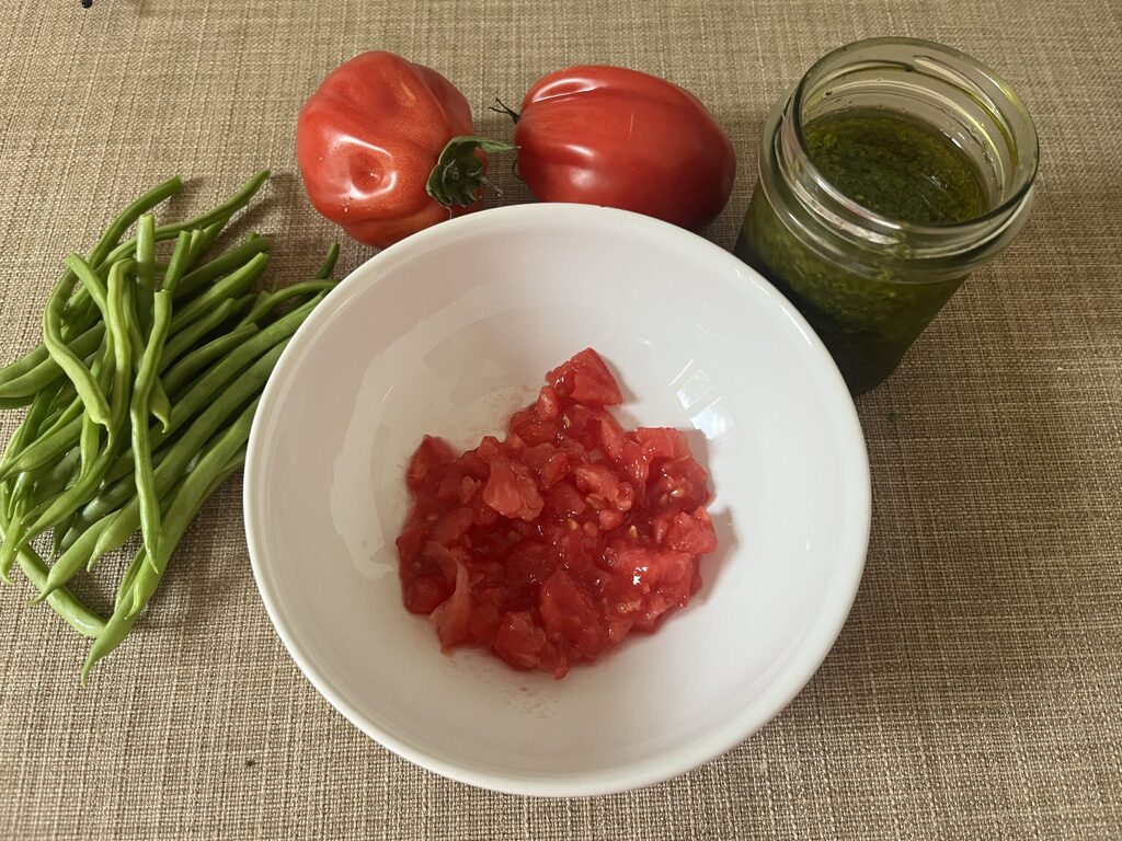 Wasche die Tomaten und die grünen Bohnen gründlich unter fließendem Wasser. Entferne die Enden der grünen Bohnen und die Schale der Tomaten. Schneide die Tomaten in kleine Würfel und, wenn die grünen Bohnen zu lang sind, breche sie in der Mitte durch.