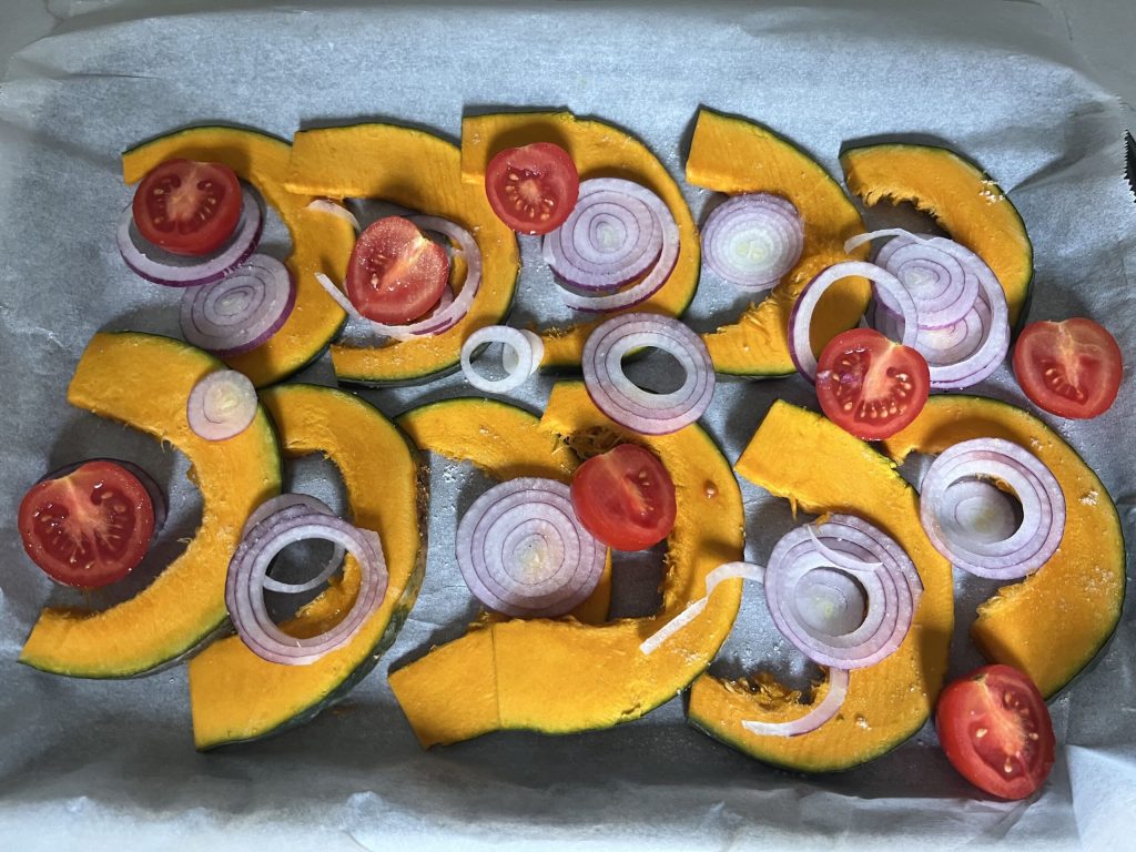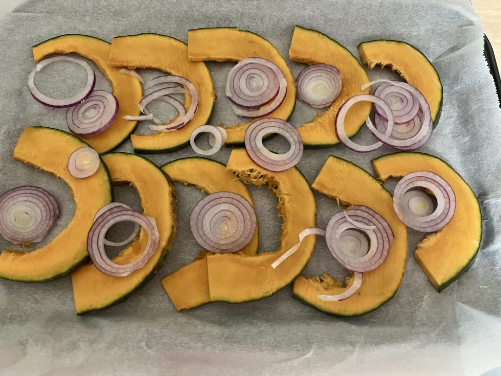 Legen Sie ein Backblech mit Backpapier aus und legen Sie die Kürbisscheiben und Zwiebeln darauf