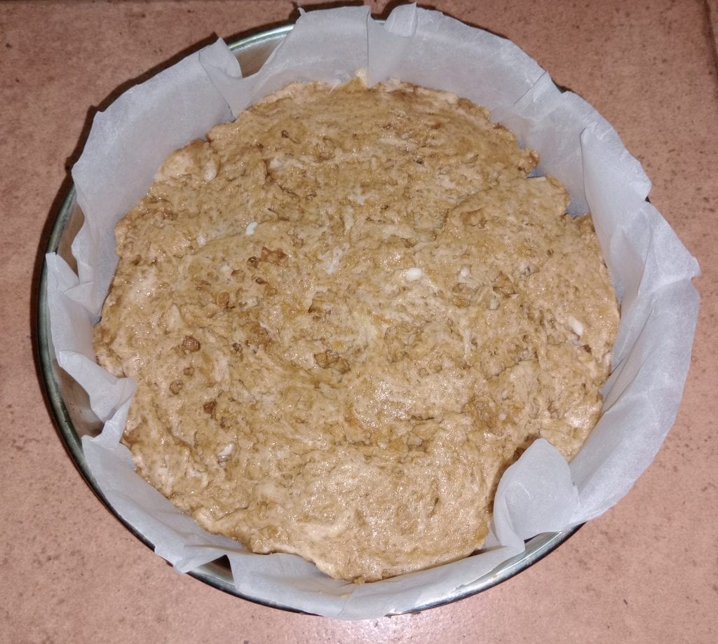 Eine Backform mit Backpapier auslegen und die Mischung hineingießen, dann mit einem Spatel glatt streichen.