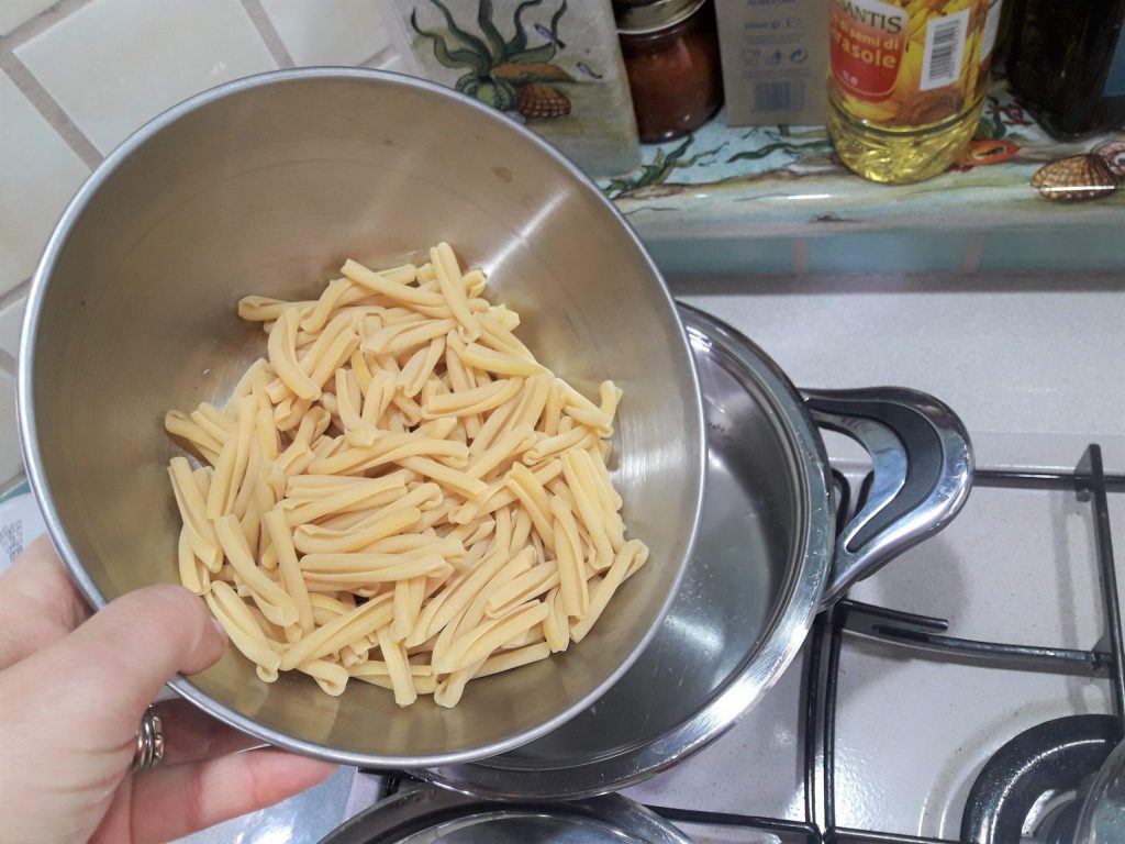 Geben Sie die Pasta in das kochende Wasser, würzen Sie sie mit Salz, und kochen Sie sie zu 3/4 der Kochzeit.