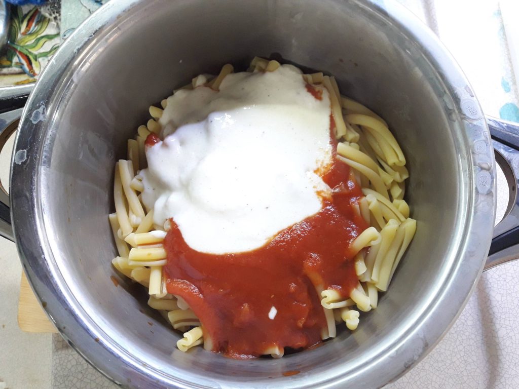 Legen Sie die Pasta zurück in ihren Topf, und fügen Sie die Hälfte der Tomatensauce und die Hälfte der Béchamel hinzu. Mischen Sie.