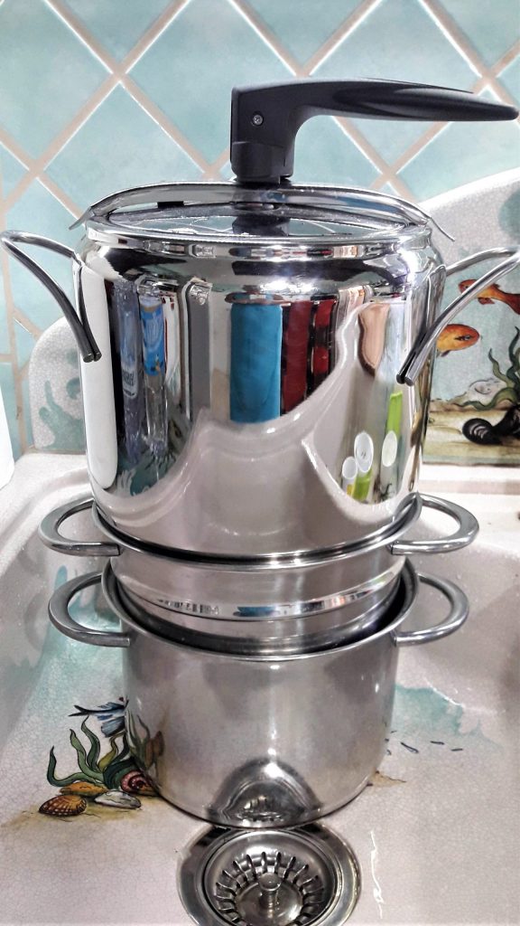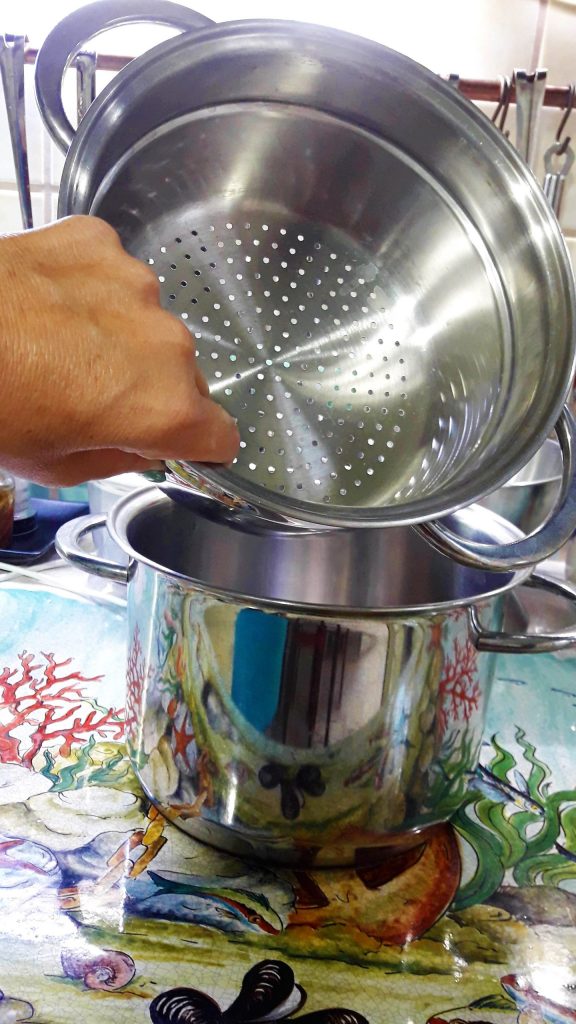 das Wichtigste ist, dass Sie ein Sieb finden, wie das, mit dem man dampfkocht, oder einen anderen Topf, der in den ersten passt.