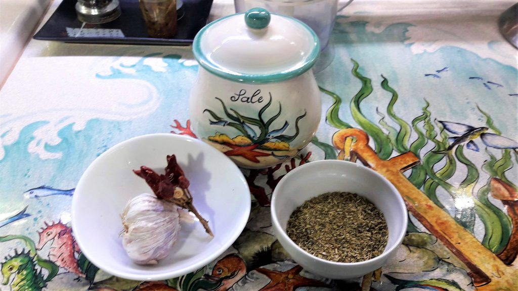 ohne Kochen, nur mit Salz Knoblauch Oregano Peperoni für wen es mag und Sonnenblumenöl.