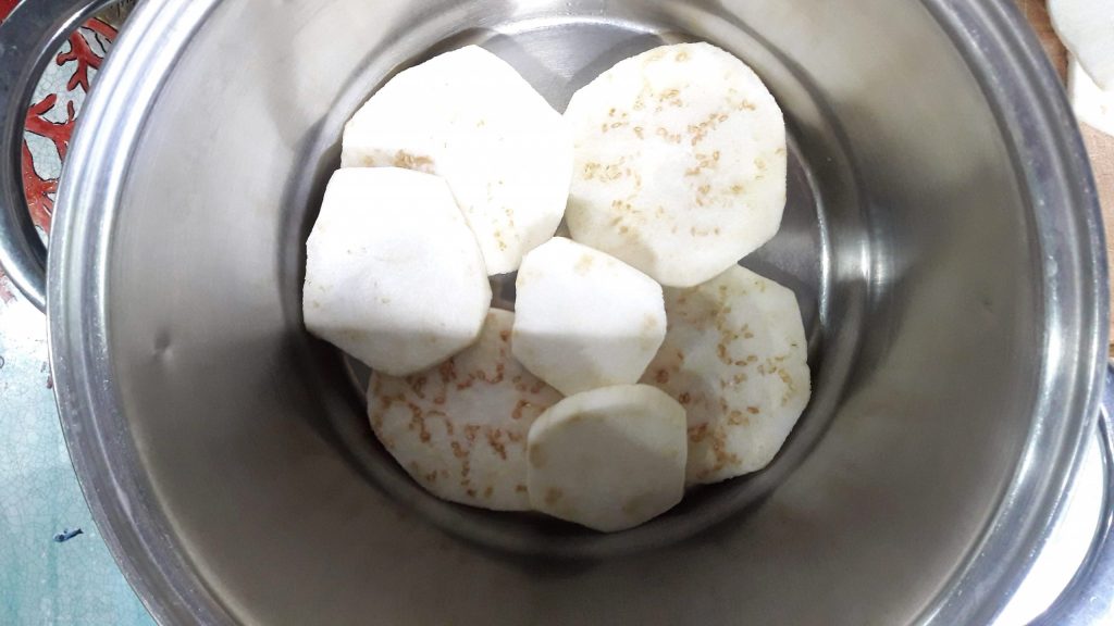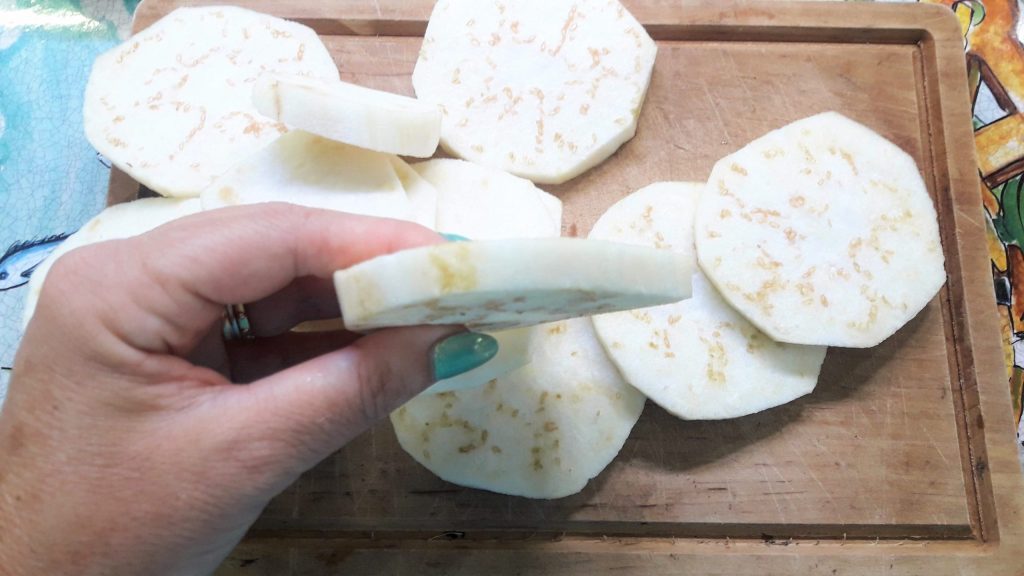 Sie können die Mandoline verwenden, so dass die Scheiben alle dieselbe Größe haben,