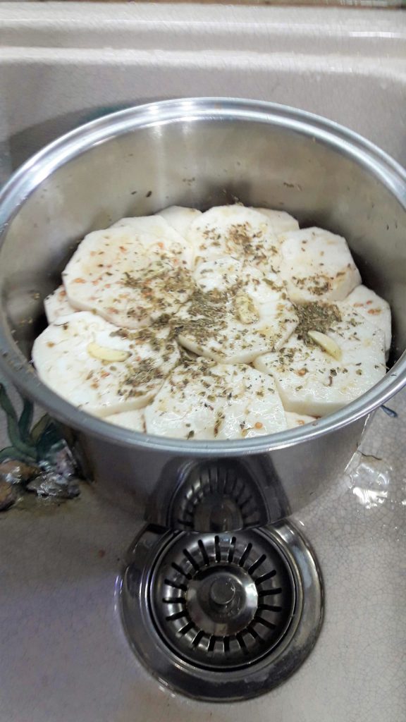 Nun, da die 24 Stunden vergangen sind, entferne ich das Gewicht, und ohne den Teller oder die Schüssel zu entfernen, drehe ich den Topf um, um die Flüssigkeit abzulassen.