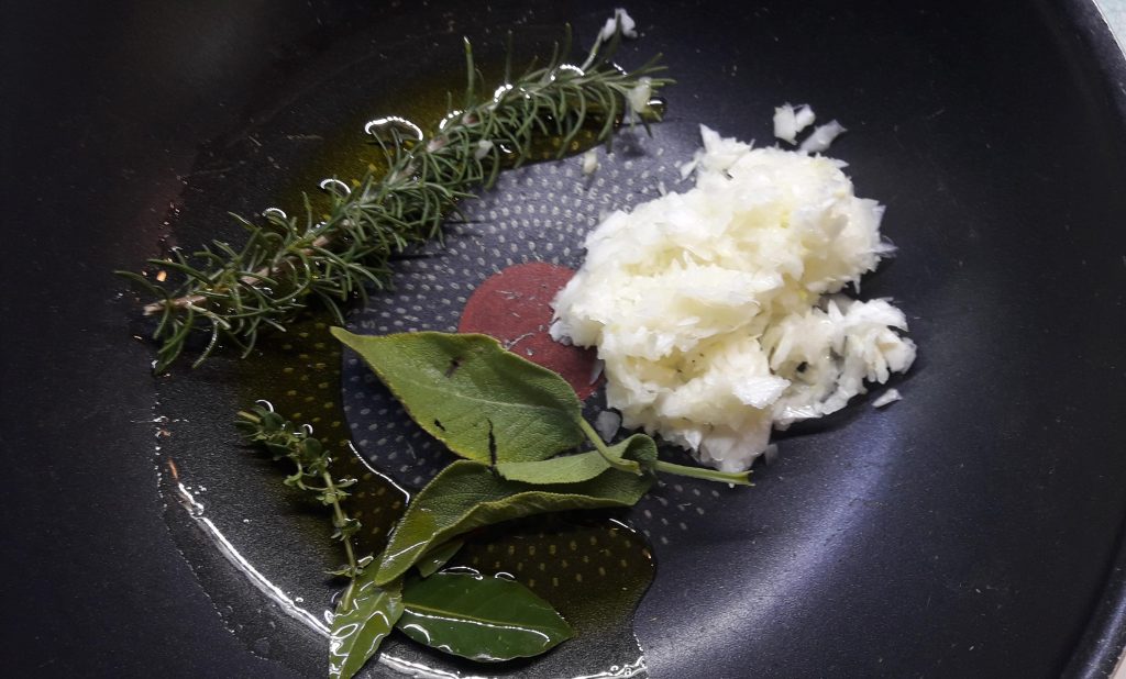 Bereiten wir die Sauce vor: In einem Wok Zwiebel, Rosmarin, Salbei, Lorbeer und etwas Olivenöl anbraten.