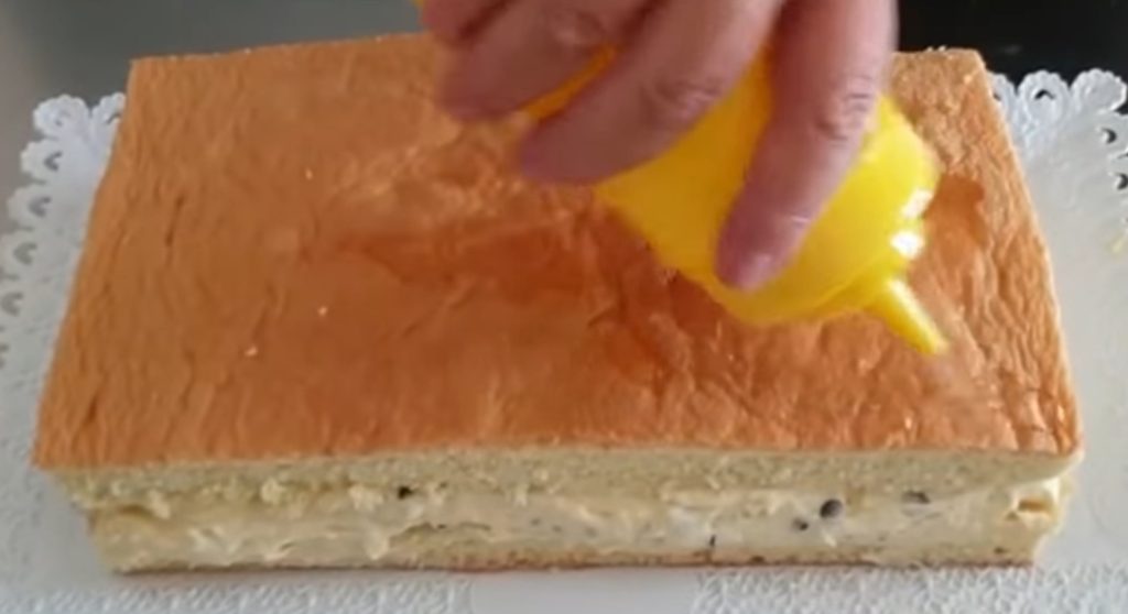 Einen Boden auf einen großen quadratischen Teller legen und mit der Hälfte der Tränke benetzen.