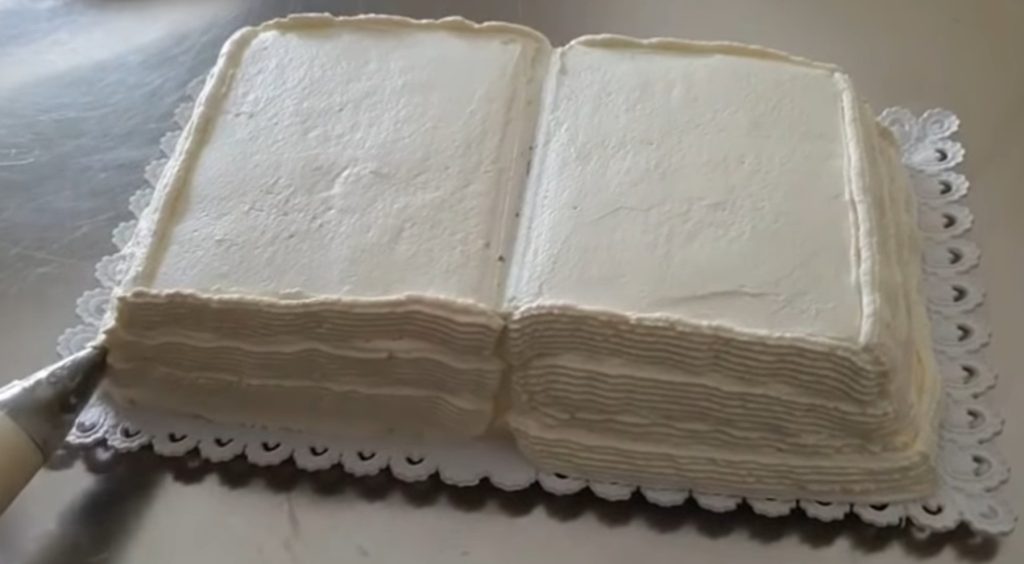 Das ganze Umfeld mit der geschlagenen Sahne dekorieren, indem man sich mit einem Spritzbeutel hilft, dann mit der Klinge eines Messers verstreichen, schließlich mit einem Silikonpinsel darüber streichen, um die Linien zu erzeugen, die an die Seiten eines Buches erinnern.