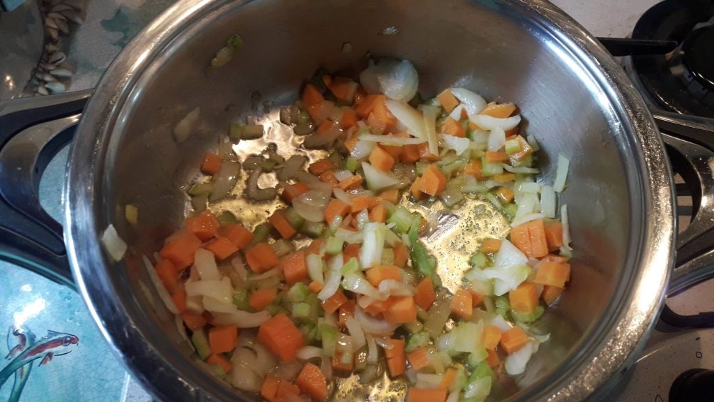 • Mit dem restlichen Gemüse ein feines Hackfleisch machen, in einen breiten Topf geben, Olivenöl hinzufügen, und