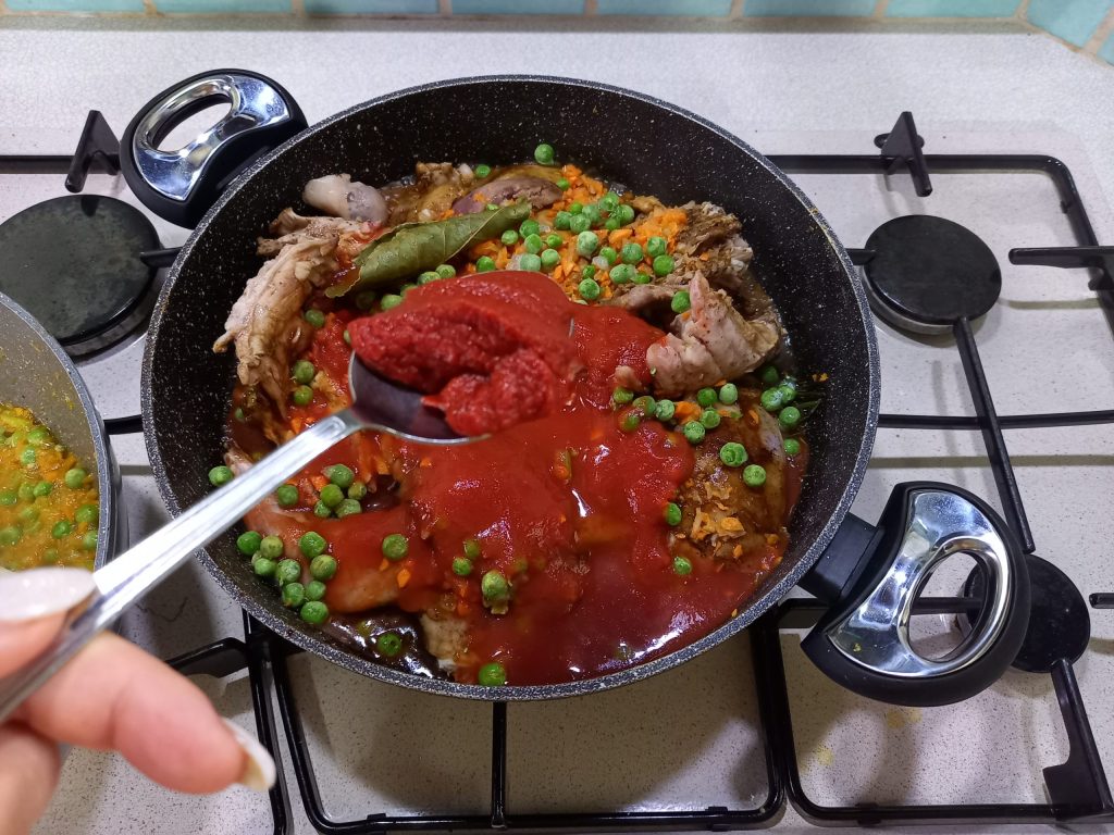 • Fügen Sie die Erbsen, die Tomatenpassata, das Konzentrat 200 g Wasser und 1 Teelöffel Salz hinzu, kochen Sie: 40 Min./100 °C/gegen den Uhrzeigersinn/Stufe Löffel..