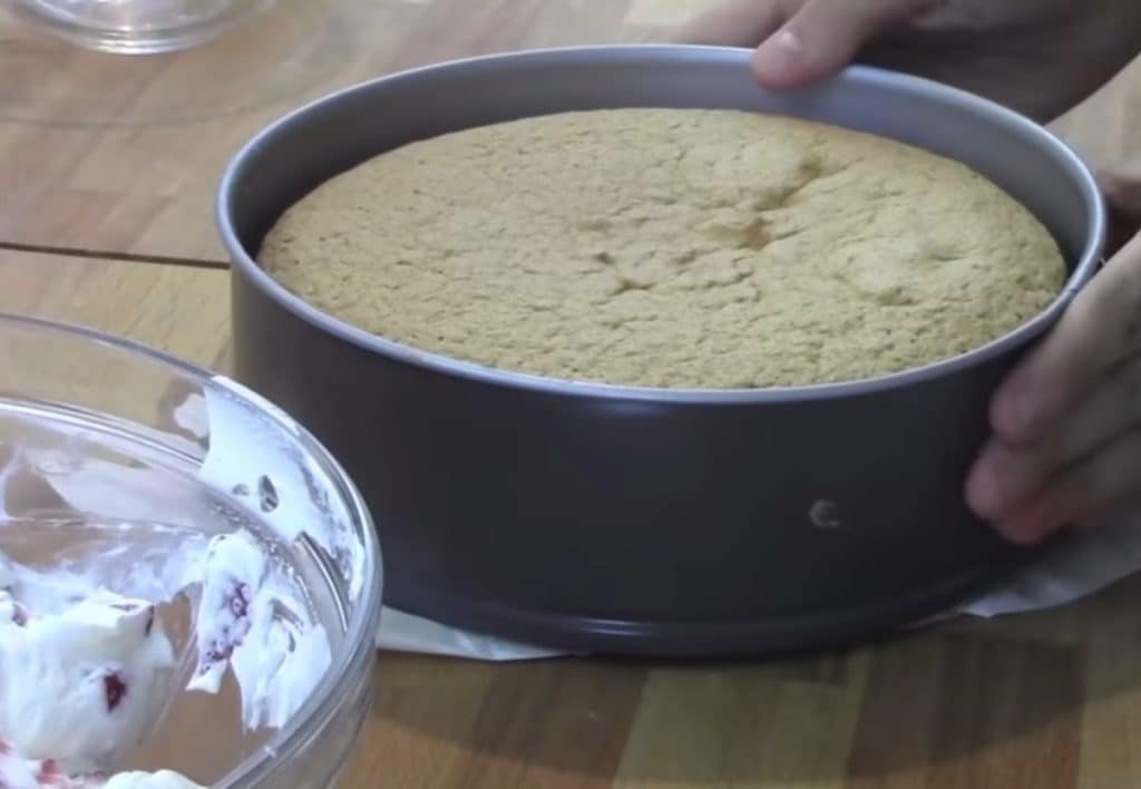 Wenn Sie zwei Biskuitböden gemacht haben, schneiden Sie sie vorsichtig in der Mitte durch, wenn Sie hingegen vier gemacht haben, sind Sie schon auf halbem Weg.
