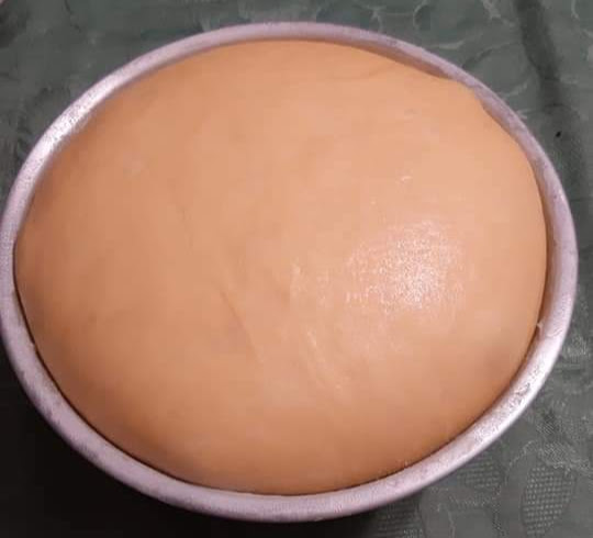 Den fertigen Teig in eine 1-kg-Form geben, die gebuttert und bemehlt ist, und an einem warmen Ort etwa 12 Stunden ruhen lassen, die Zeit variiert je nach Raumtemperatur.