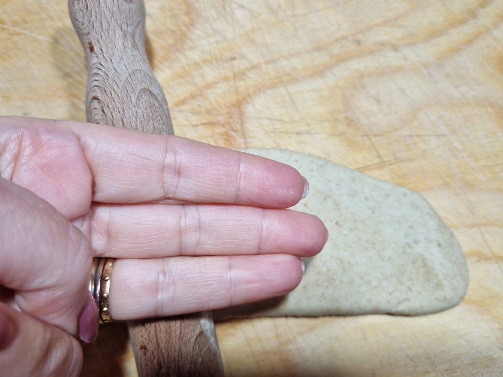 Die Sie anschließend flach drücken, um 3 Finger breite und 3 mm dicke Streifen zu machen.
