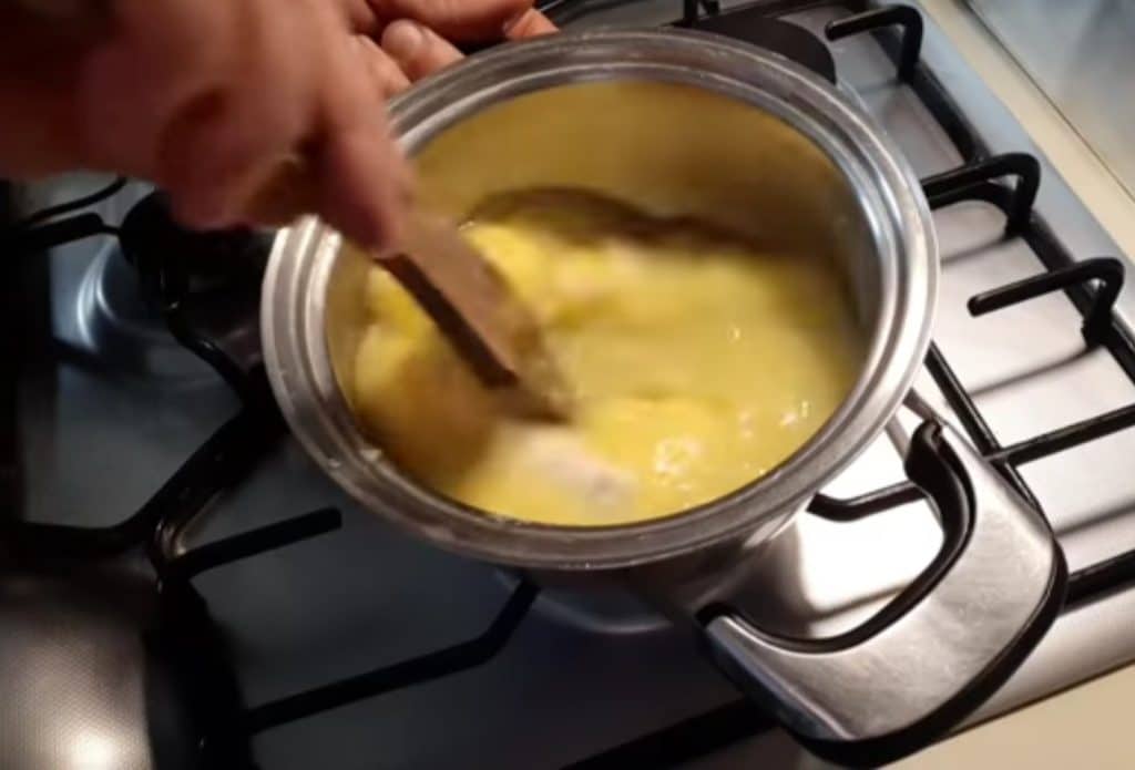 • das gesamte Mehl hinzufügen, die Flamme reduzieren und