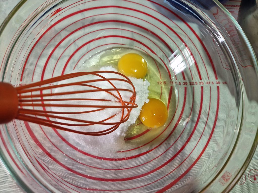 Nachdem er abgekühlt ist, gehen wir zur restlichen Füllung über.In einer Schüssel das ganze Ei, den restlichen Süßstoff und den Vanillinzucker hinzufügen und mit einem Schneebesen aufschlagen, bis die Mischung schön voluminös und schaumig ist