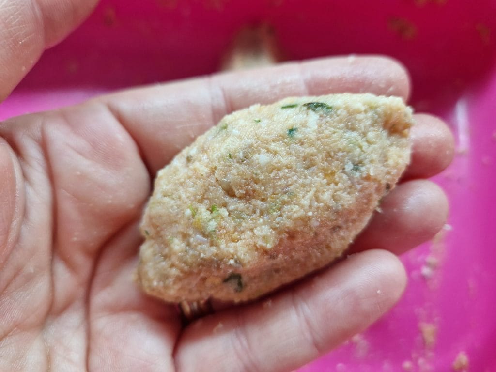 Und.. kneten Sie, bis Sie eine feste Masse erhalten. Wenn nötig, können Sie mehr Semmelbrösel hinzufügen, wenn es zu weich ist, oder ein paar Tropfen Wasser, wenn es zu fest ist.