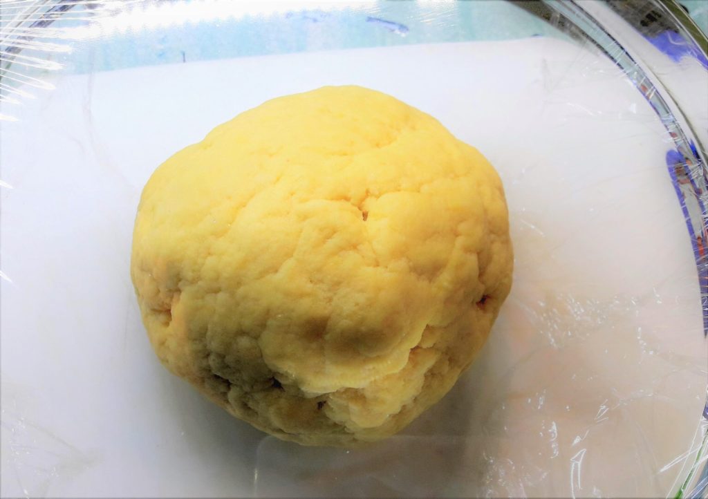 Wickeln Sie den Teig in Frischhaltefolie und lassen Sie ihn etwa 1 Stunde im Kühlschrank ruhen.