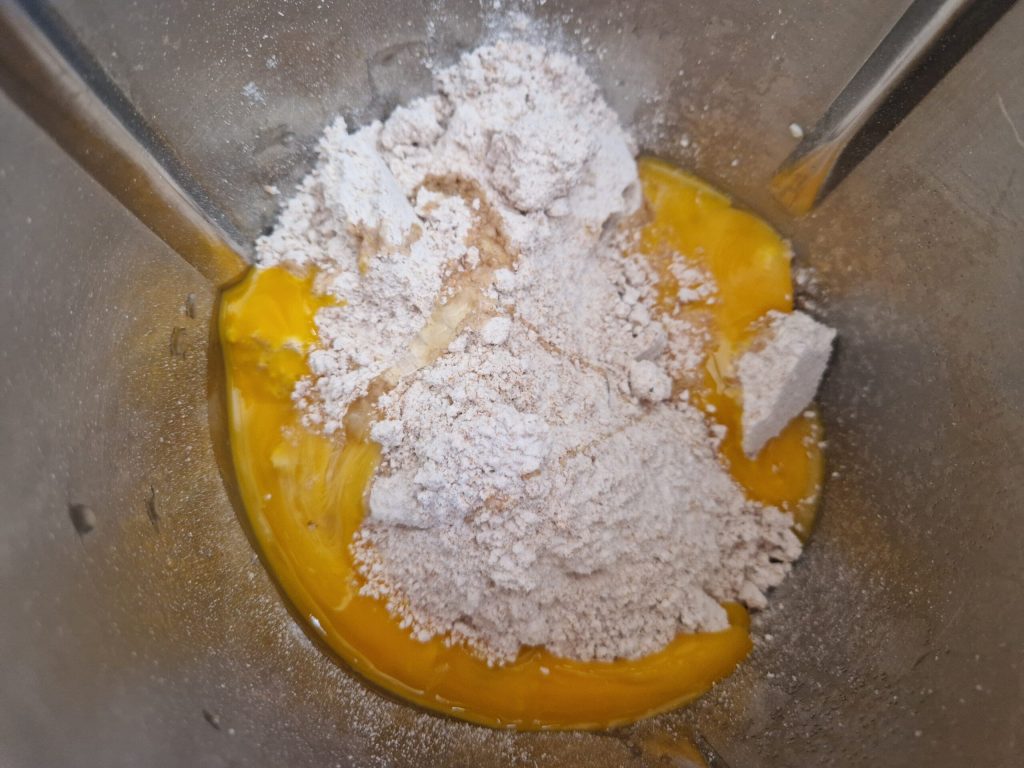 Nun spülen und trocknen Sie den Mixbecher. Geben Sie hinein: die Eier, das Mehl, das Erythrit, die Vanille und das Backpulver, und die Zitronenschale: stellen Sie für drei Minuten auf Teigkneten ein.