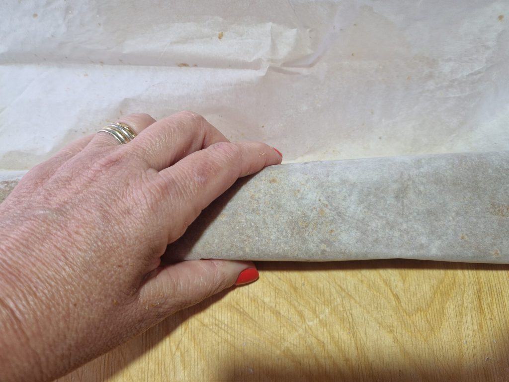Mit leicht angefeuchteten Händen versuchen Sie, das Ganze zu versiegeln. Helfen Sie sich auch mit dem selben Backpapier, um eine leicht flache Rolle zu formen.