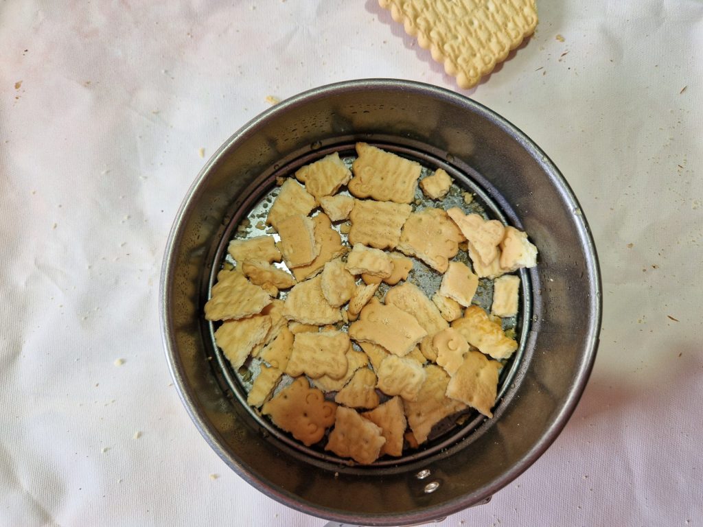 Fetten Sie eine Springform mit Öl ein und legen Sie Stücke von Keksen auf den Boden, um die gesamte Basis zu bedecken,