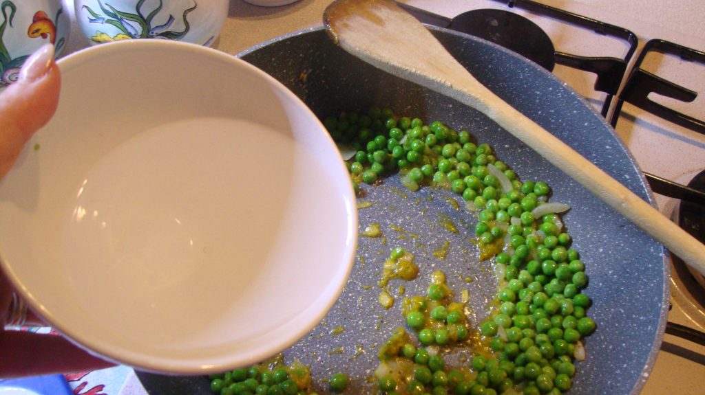 Füge anschließend die Erbsen hinzu, falls du gefrorene verwendest, tau sie vorher auf, und mische alles.