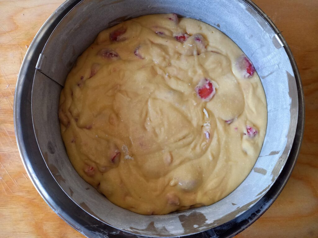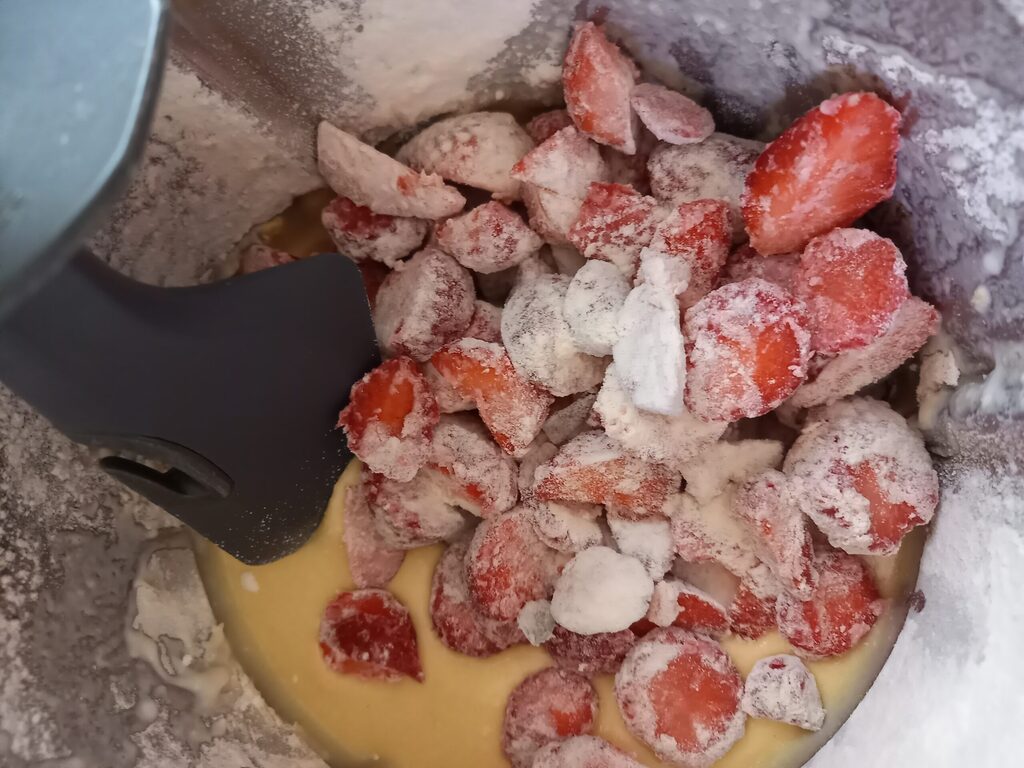 Sobald eine homogene Masse erreicht ist, schütteln Sie die Erdbeeren von überschüssigem Mehl ab und fügen Sie sie dem Teig hinzu.