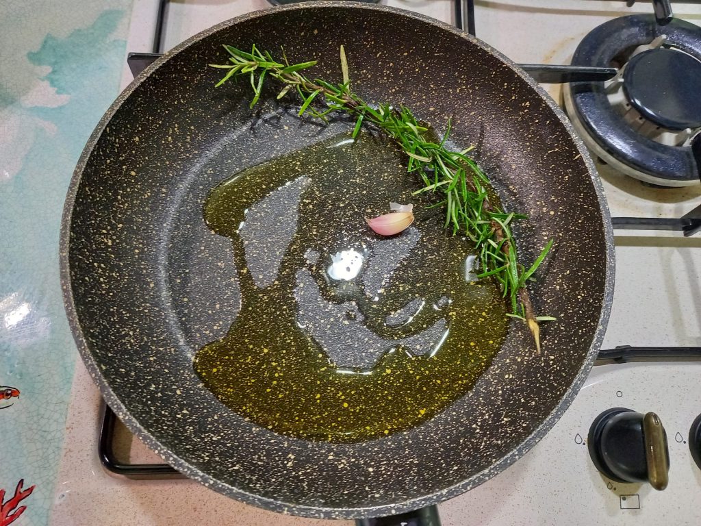 Erhitzen Sie eine Pfanne mit 1 Knoblauchzehe, einem Zweig Rosmarin und etwas nativem Olivenöl extra.