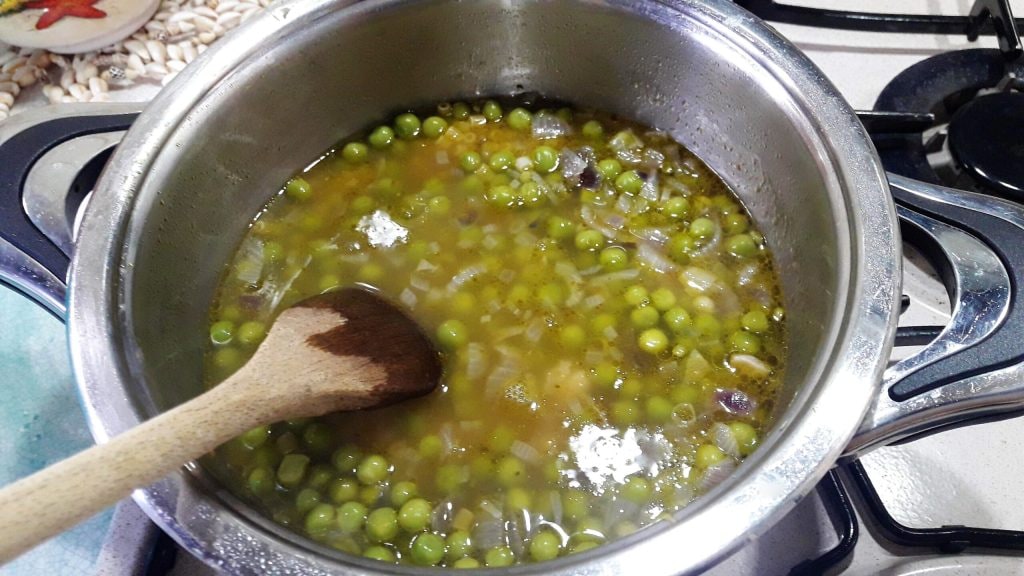 Fügen Sie an dieser Stelle die Erbsen, den Gemüsebrühwürfel und 400 g Wasser hinzu.