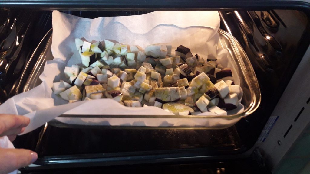Zuerst die Auberginen in Würfel schneiden, ich backe sie im Ofen mit Olivenöl, Salz, Pfeffer und Oregano, im vorgeheizten Ofen bei 180° für 20 Minuten.