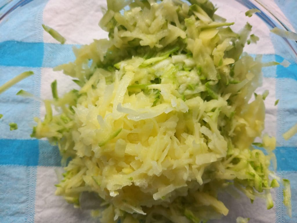 Zucchini und Kartoffeln reiben. Sammle sie in einem sauberen Tuch und drück sie aus. So verlieren sie ihr überschüssiges Wasser.