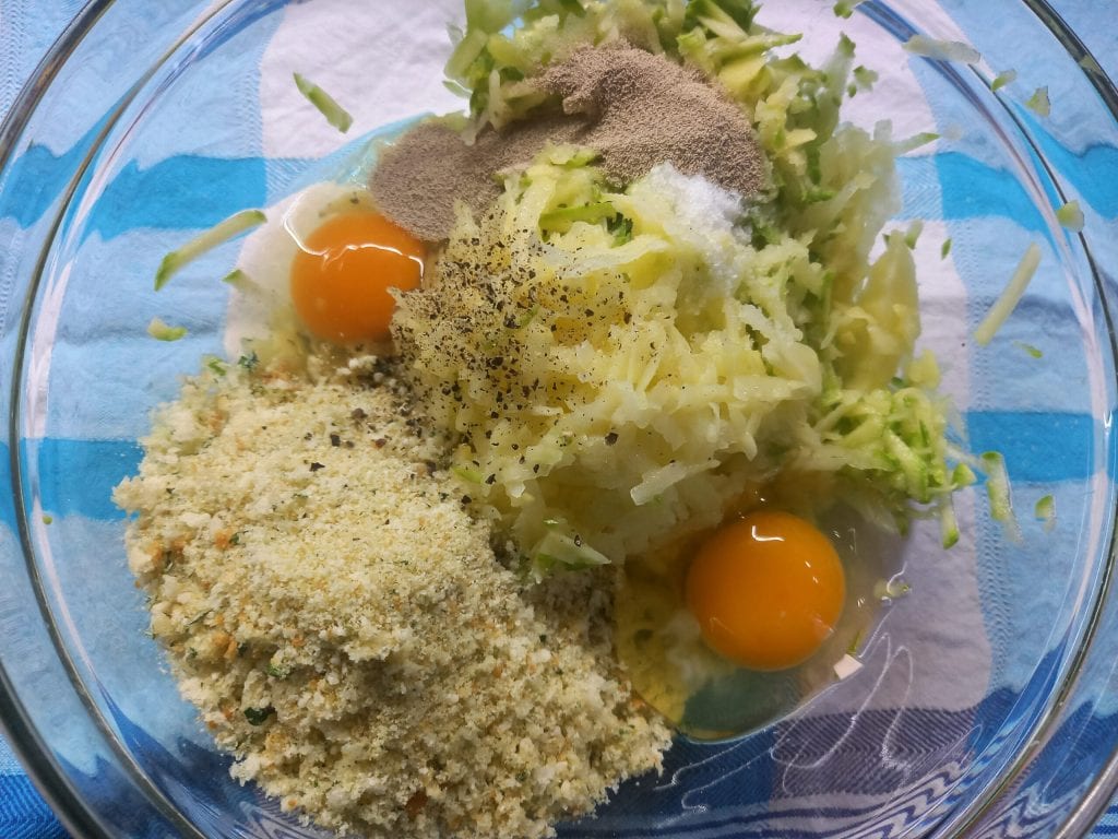 Gib in eine Schüssel die geriebenen Zucchini und Kartoffeln, eine Prise Salz und Pfeffer, die Eier, die Hefe, das sizilianisch gewürzte Paniermehl.