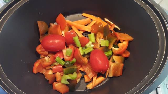 Ich habe das Gemüse geschält und geschnitten: die Karotten in Stäbchen, die Paprika in Würfel, den Selleriestiel in Stücke. Die Tomaten ganz und ich habe sie in den Varoma gelegt.